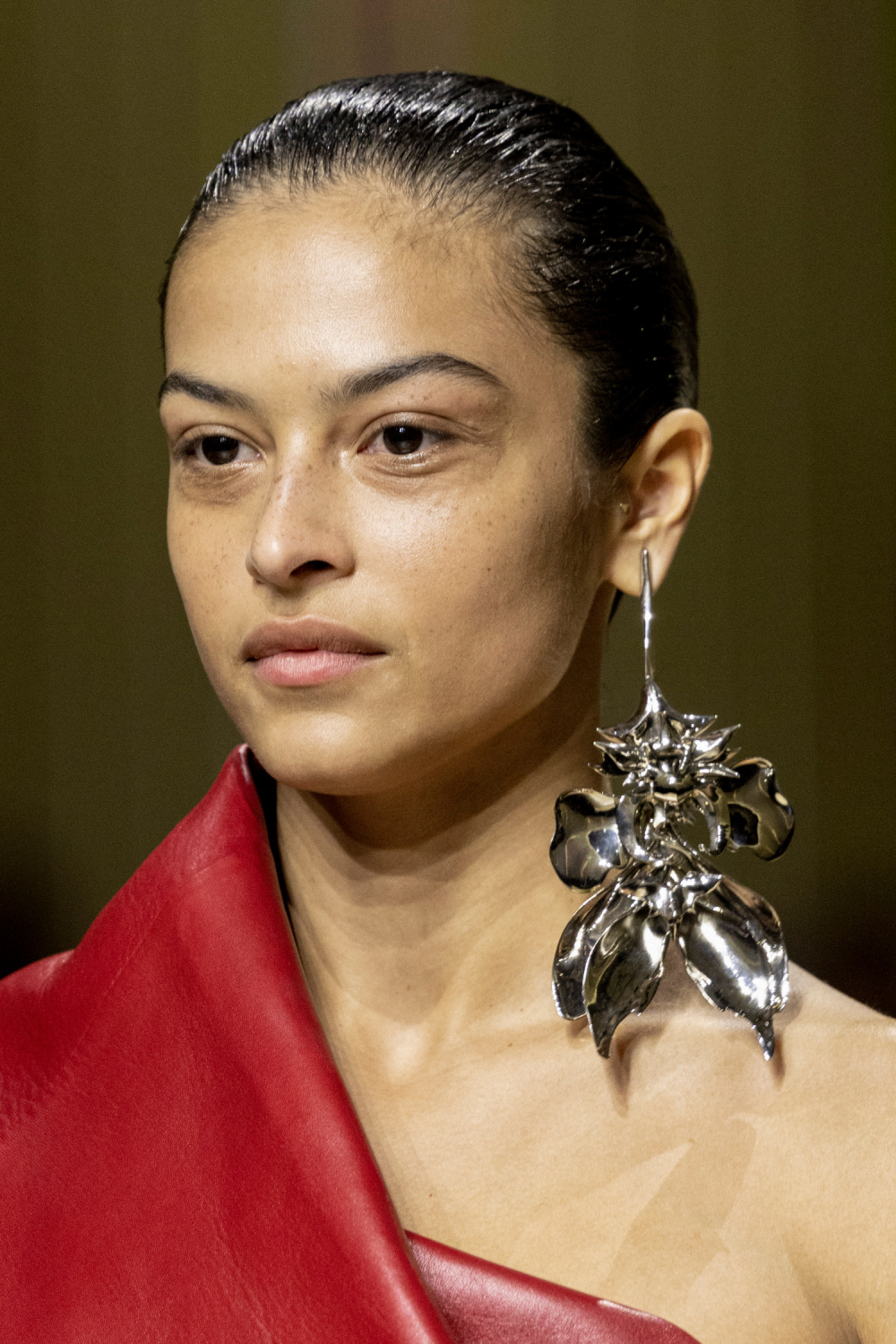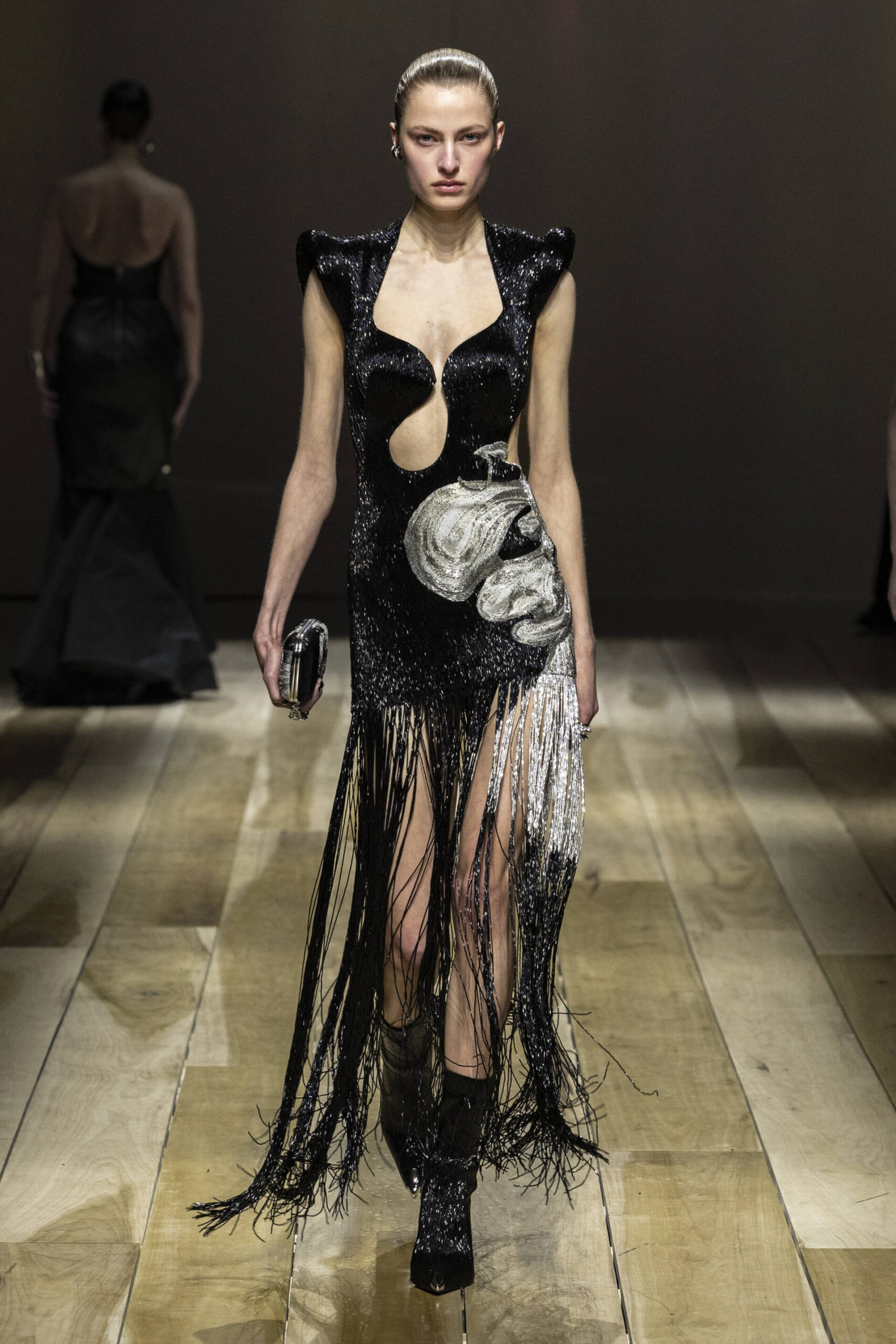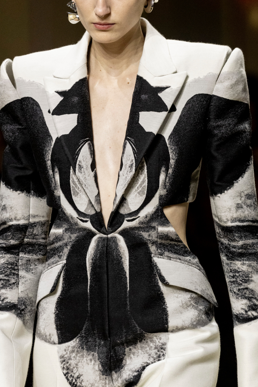 Garments are dissected: slashed, sliced and twisted. Shoulders are strong. Waists are narrow. Heeled trousers elongate the leg: the bumster in reverse. The most prominent motif in the collection is the orchid, in its rarer forms cultivated but, after the daisy, the most common flower. It thrives in the air, resists being rooted and grows in the wild. Extraordinarily beautiful and infinitely adaptable, the orchid mimics both predator and prey. In the language of flowers, the orchid is a symbol of love.” Sarah Burton, Creative Director