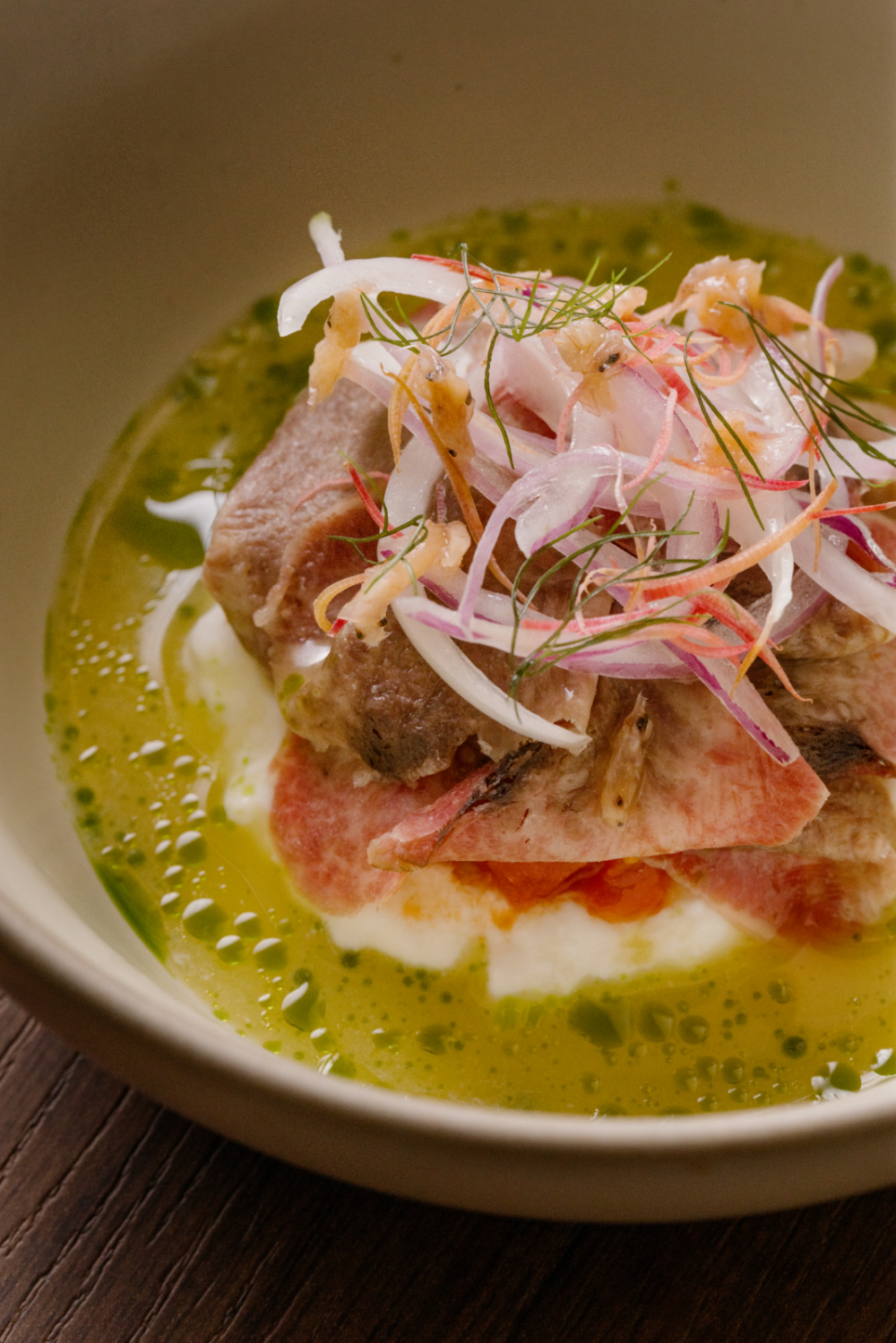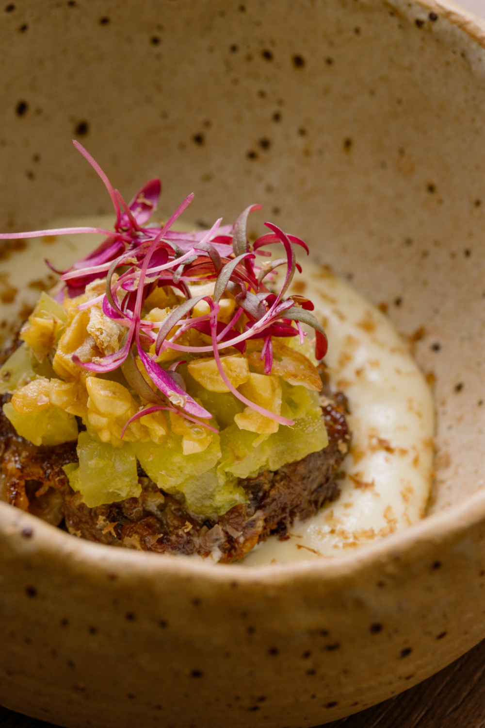 The Crispy Scale Marble Goby extends this ethos. Cashew and candlenut form the base of a velvety curry, while a seaweed laksa verde brings freshness and brine. The fish itself is used in its entirety: the skin crisped, the flesh tender, and the trimmings repurposed. What might have been discarded becomes central to the dish, embodying chef’s whole-ingredient philosophy.