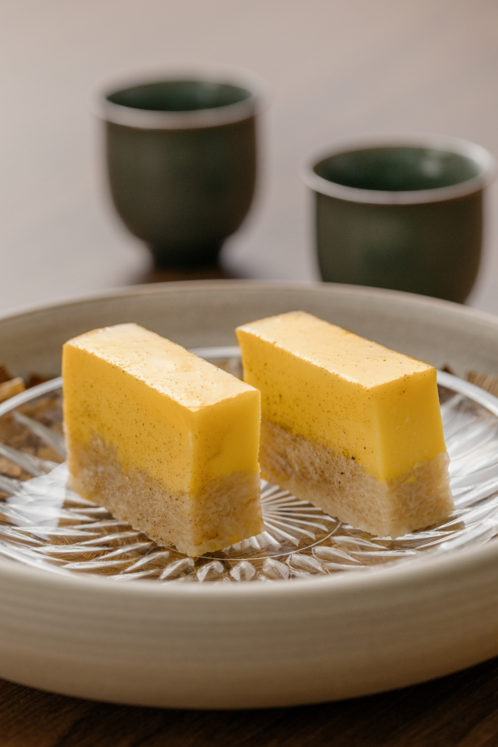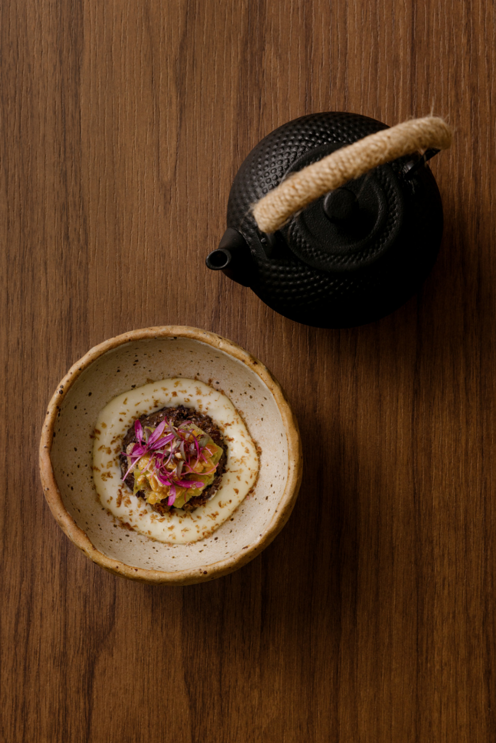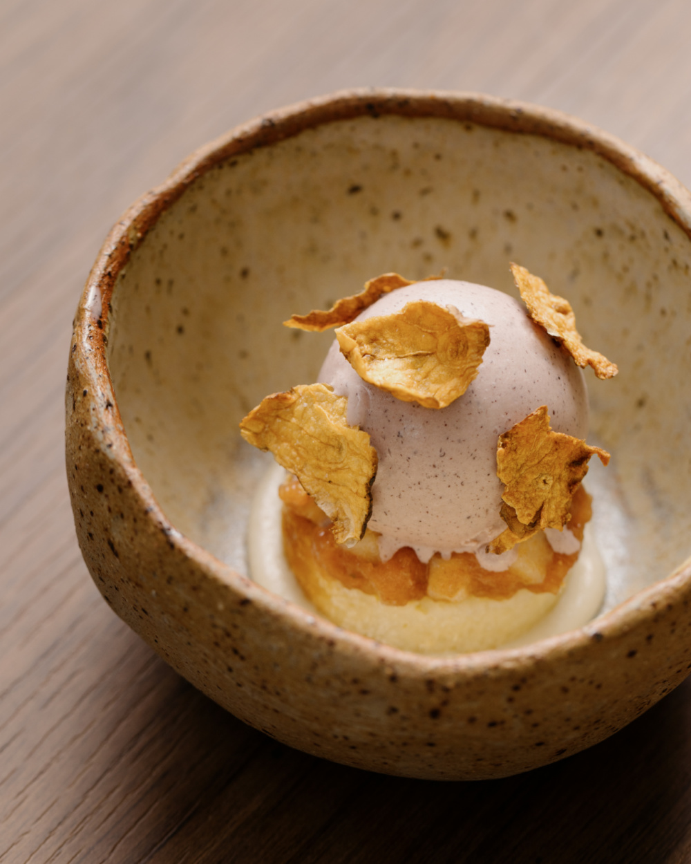 Dessert arrives as Sunchoke Bingka, a familiar kueh reinvented through fermentation. The base is enriched with the earthy sweetness of sunchoke and paired with a black rice amazake ice cream, which adds a gentle tang and depth. Pear Chantilly brings lightness, while chiku ties the dish back to local memory. The result is a dessert rooted in tradition yet layered with invention, bridging generations through taste.