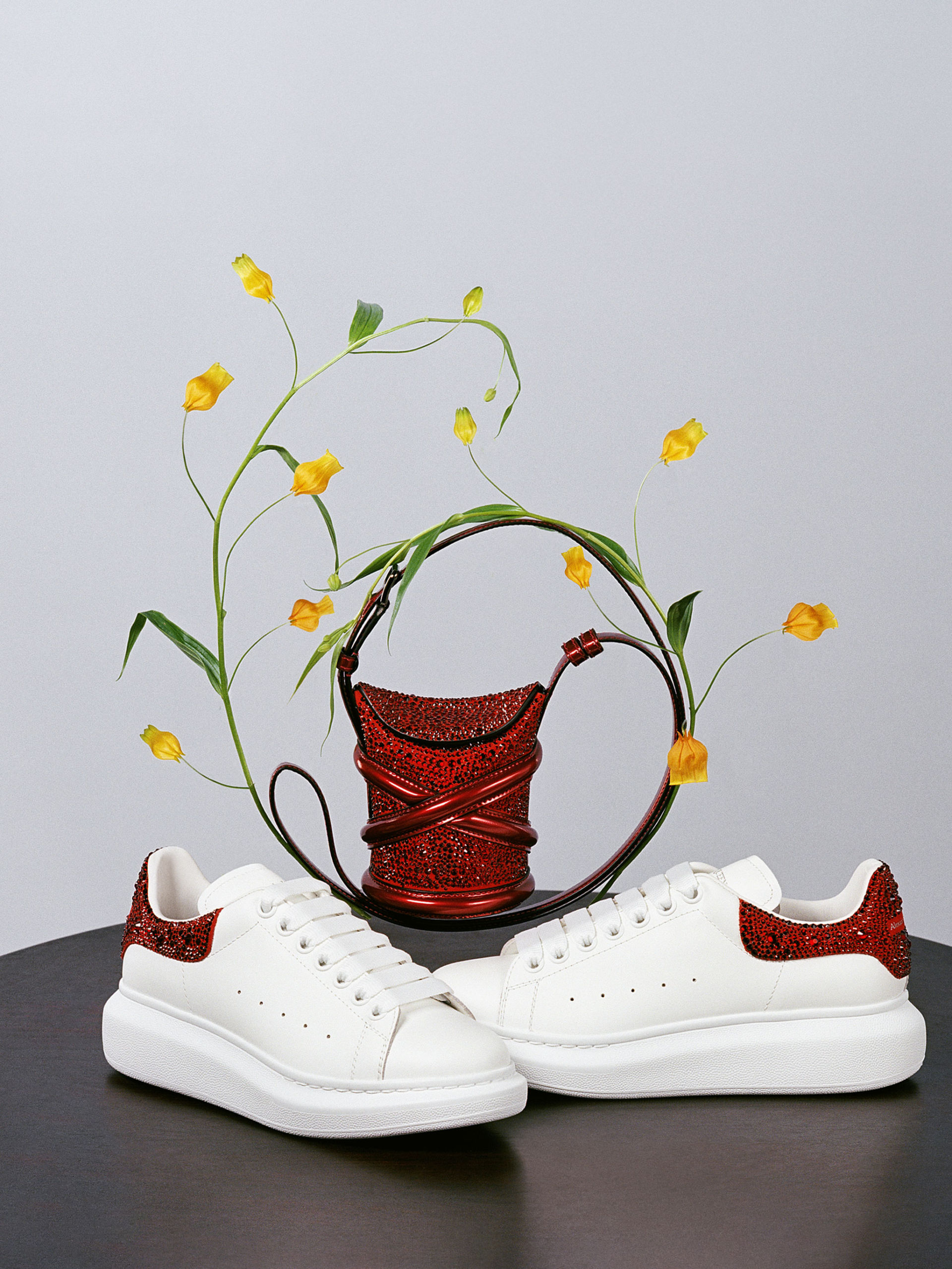 Alexander McQueen introduces a special capsule collection to celebrate Chinese New Year. Principally characterised by red, famously the colour of good fortune, iconic pieces including The Curve and Curve Mini bags – in metallic leather and set with crystals- and the Oversized Sneaker set with crystals again or in classic white leather with a contrast red back feature.