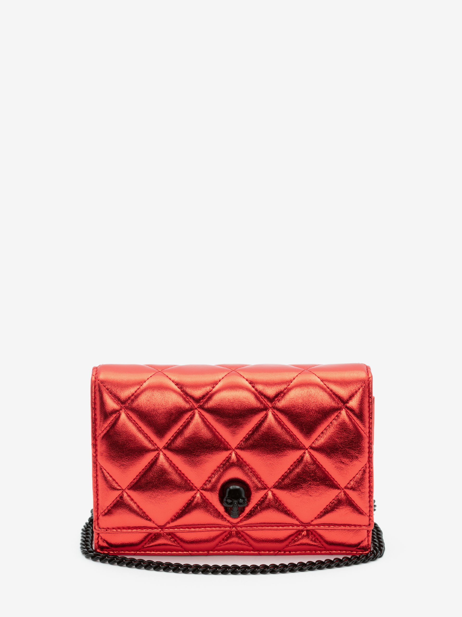 Small leather goods include quilted metallic leather purses with a signature skull closure in black, and credit card holders, a black leather coin purse stamped with a red McQueen seal and metallic skull socks.