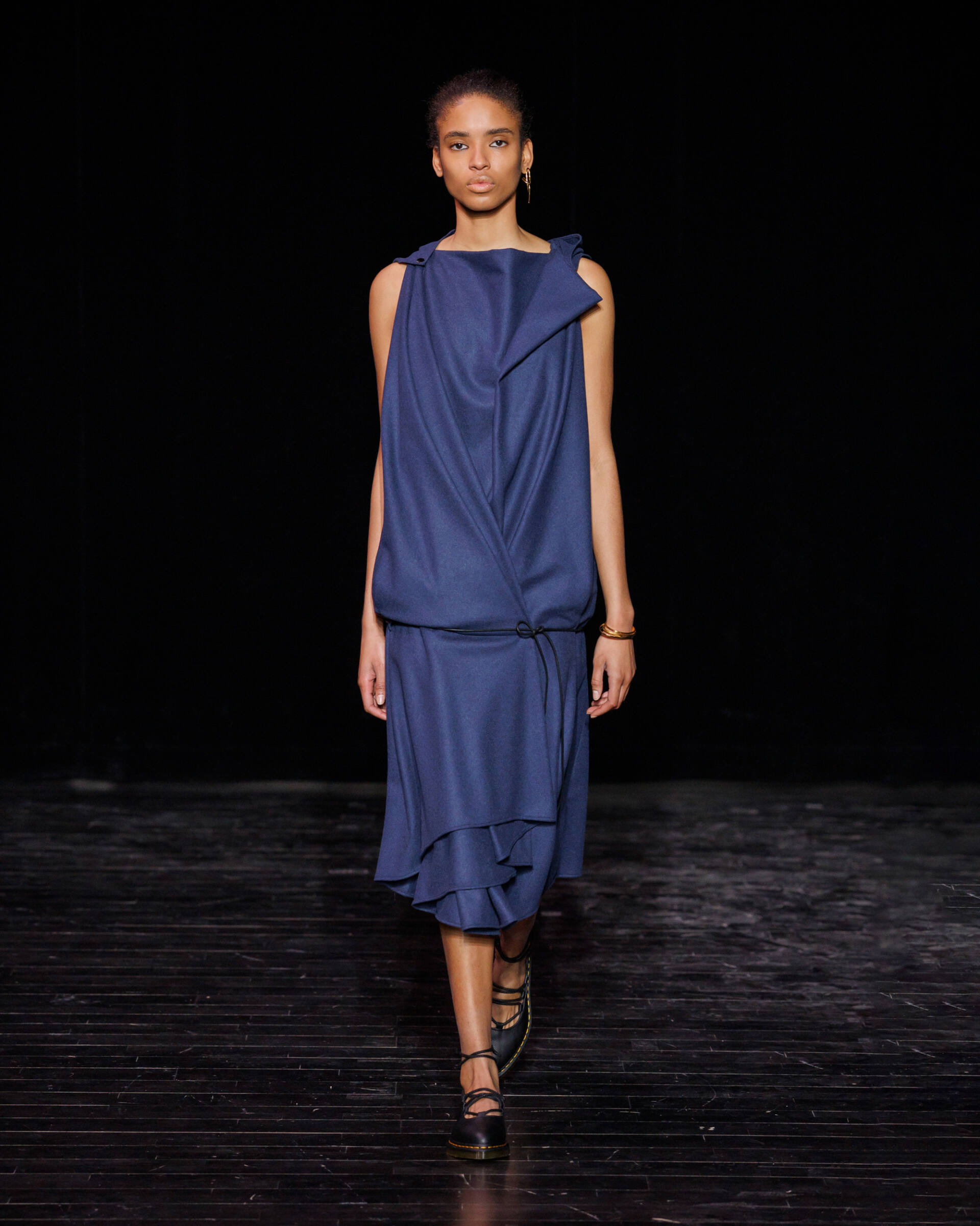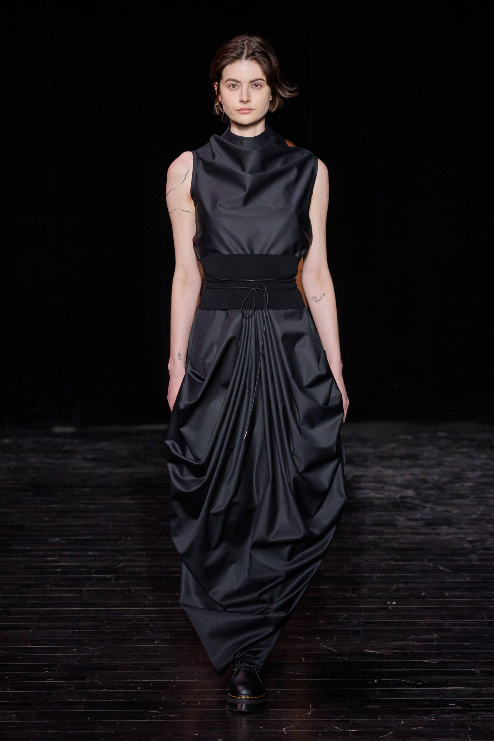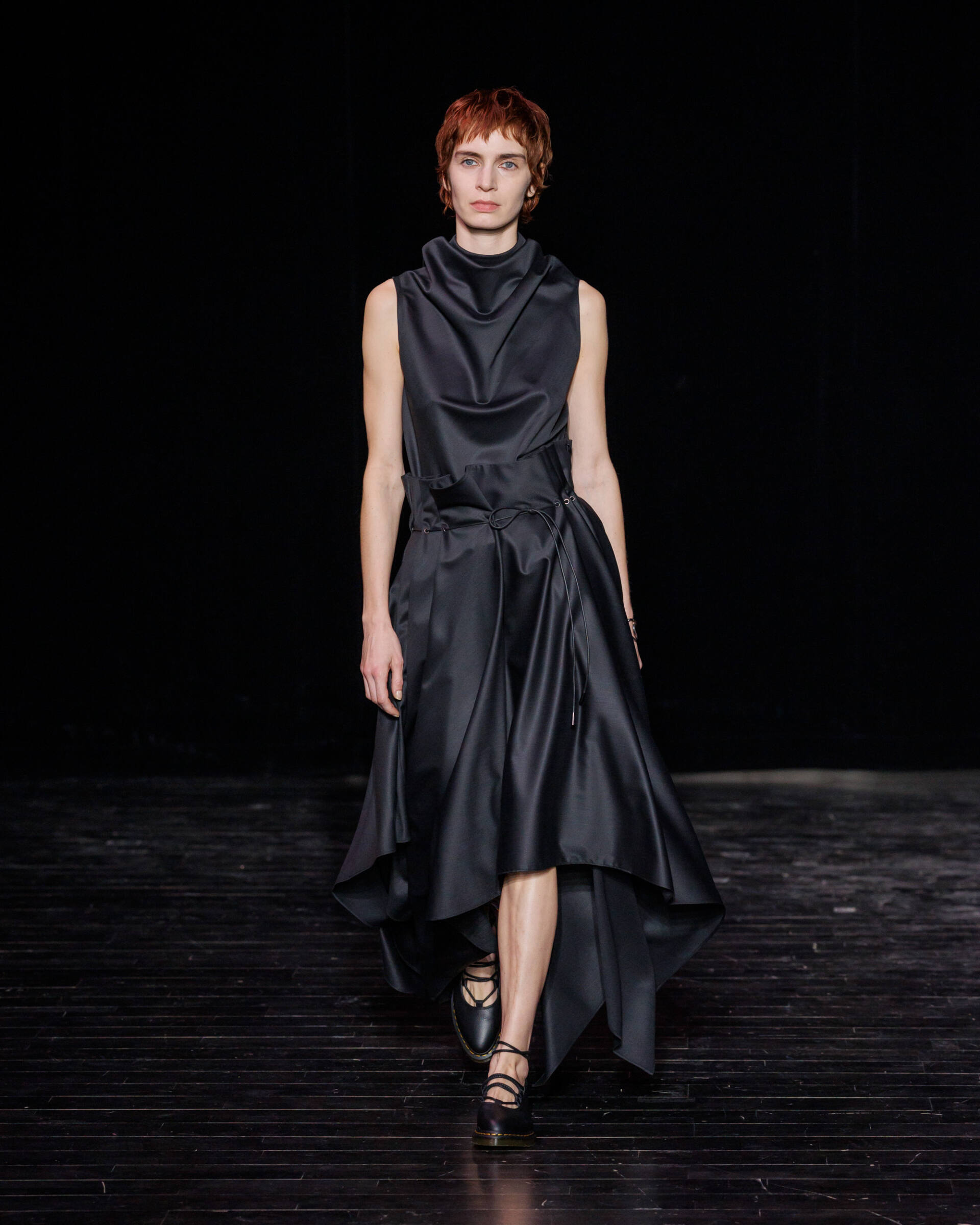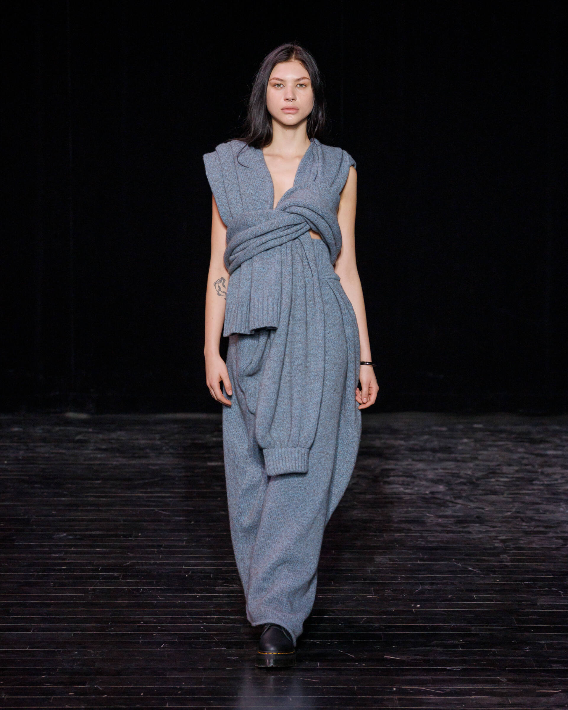 Through draping techniques, architectural pleats, and bold layering, each piece becomes a dialogue between structure and fluidity. MOSSI’s DNA is expressed through sculptural silhouettes, marked by asymmetry and deconstruction, which are key signatures of the house. This season, the signature pleats take new form as belts, while iconic elements from the MOSSI wardrobe subtly appear throughout the runway.