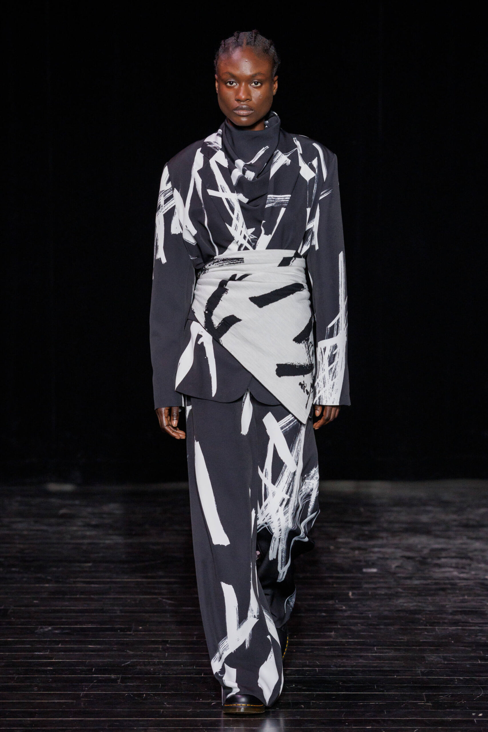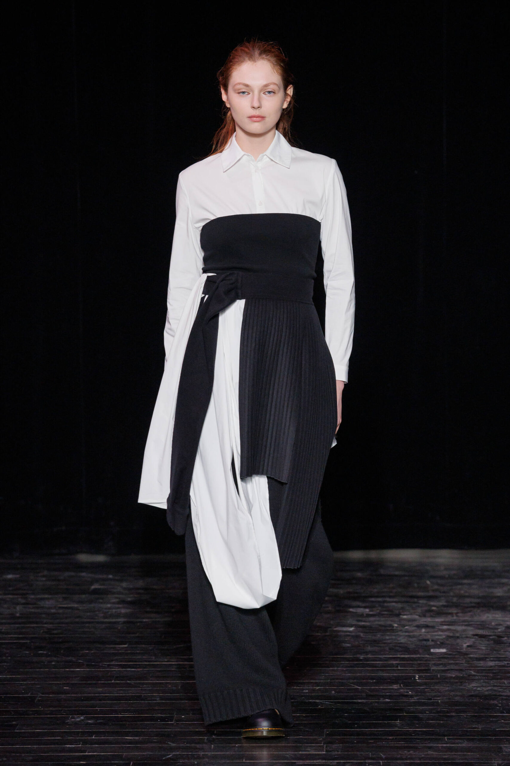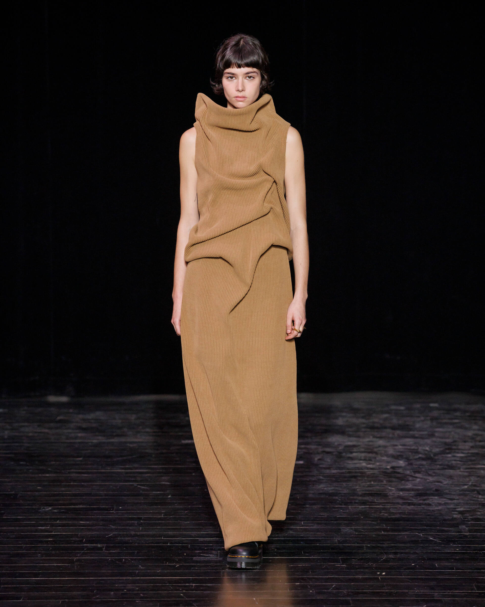 Through draping techniques, architectural pleats, and bold layering, each piece becomes a dialogue between structure and fluidity. MOSSI’s DNA is expressed through sculptural silhouettes, marked by asymmetry and deconstruction, which are key signatures of the house. This season, the signature pleats take new form as belts, while iconic elements from the MOSSI wardrobe subtly appear throughout the runway.