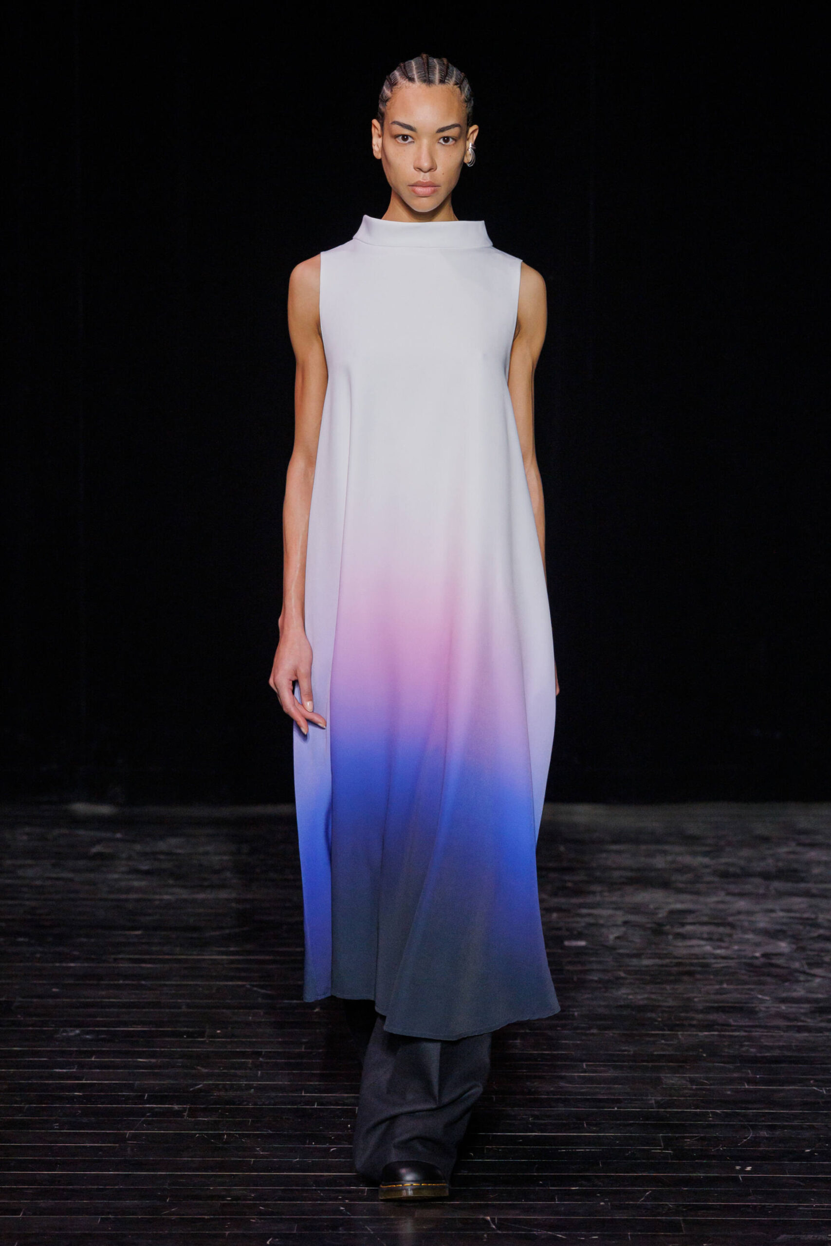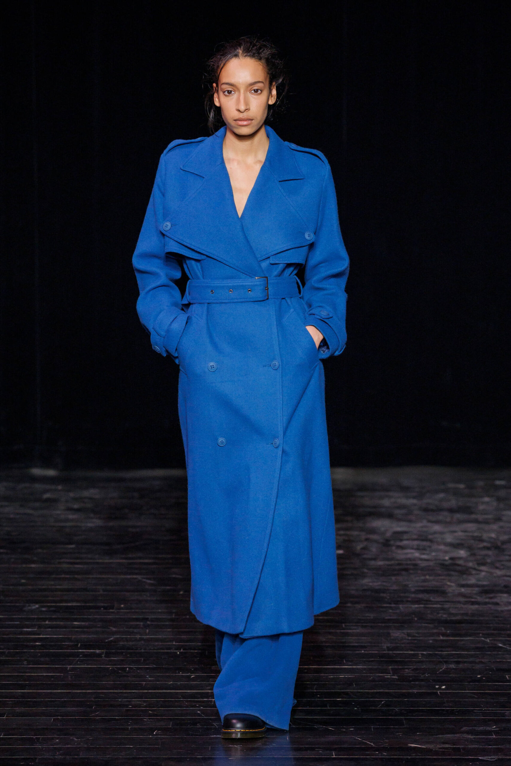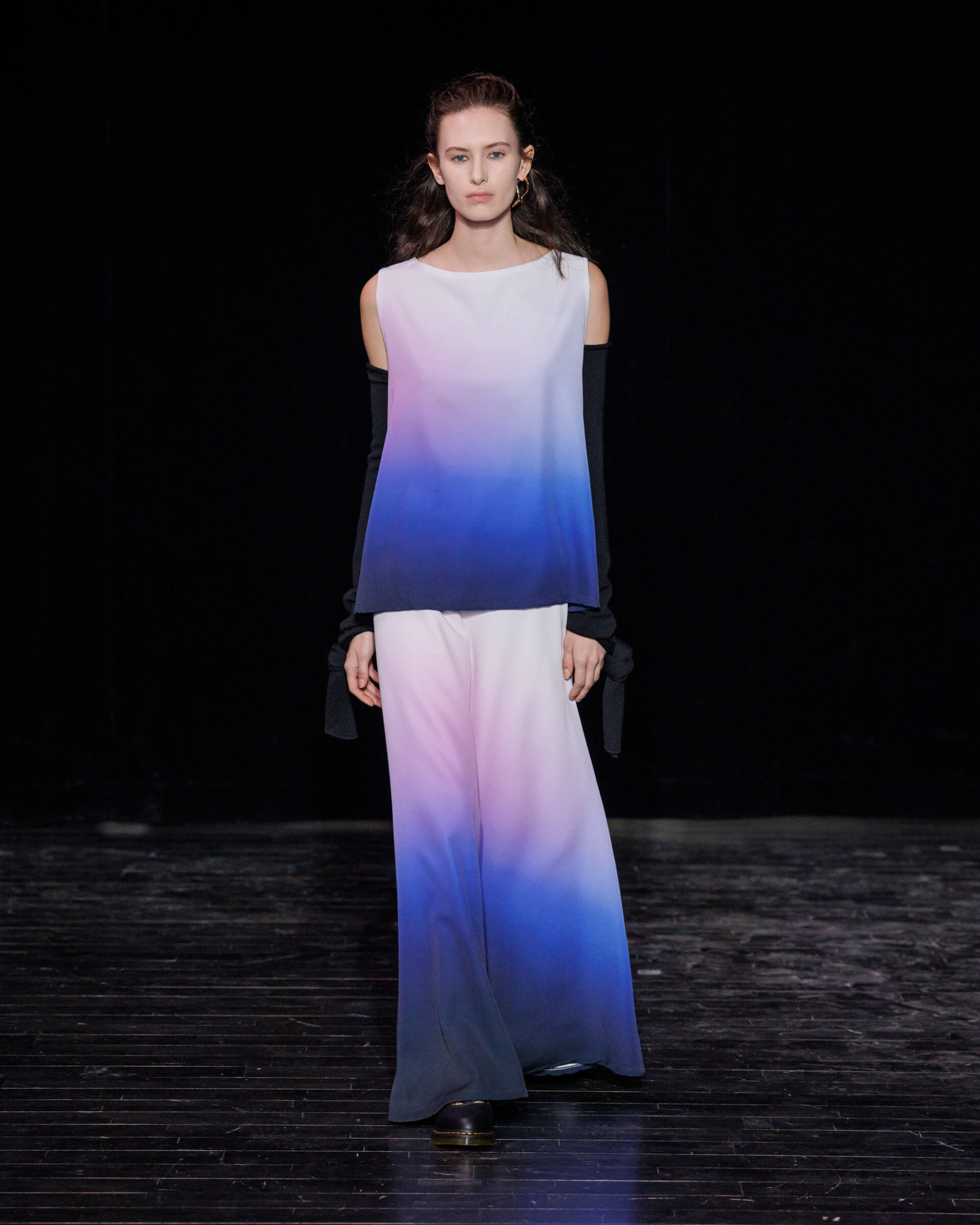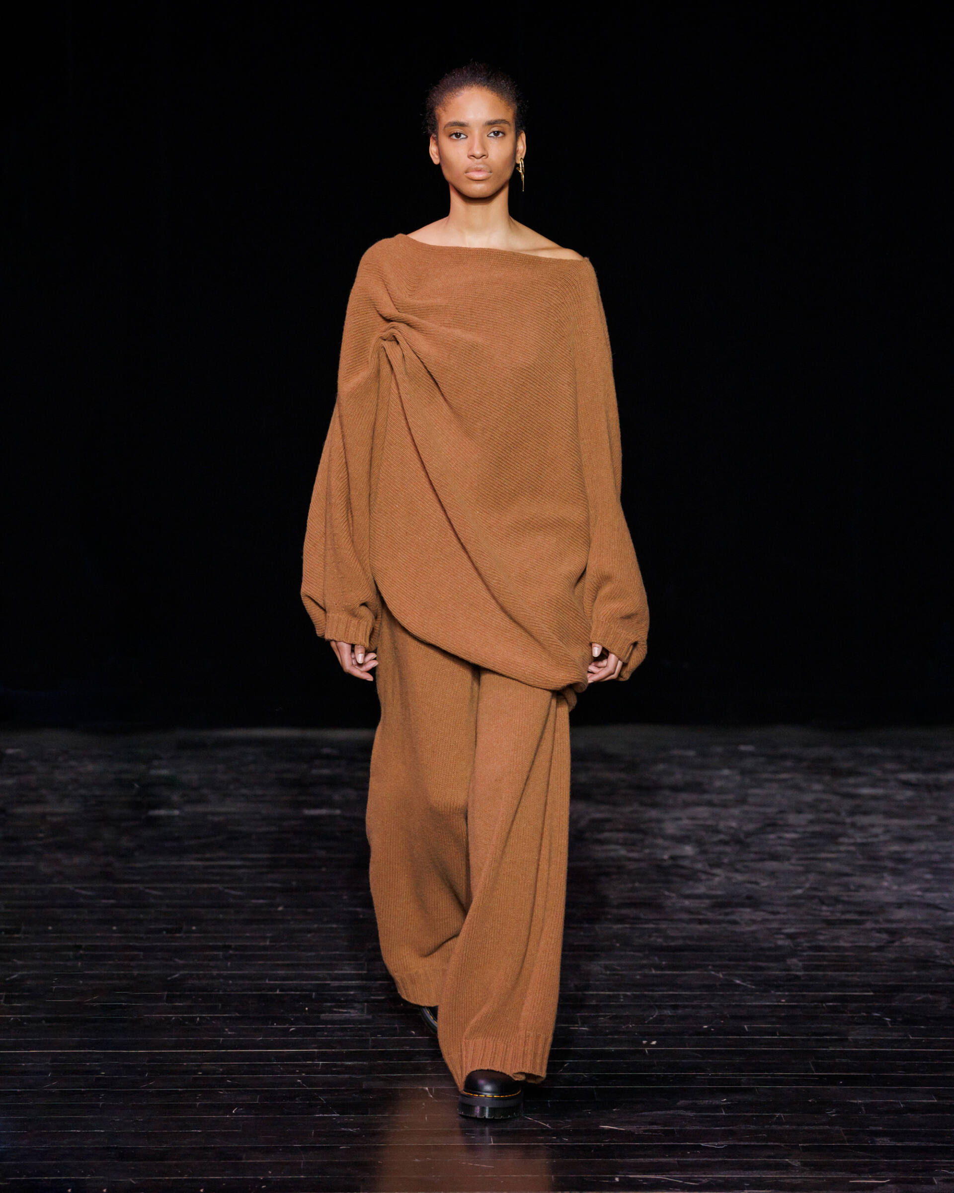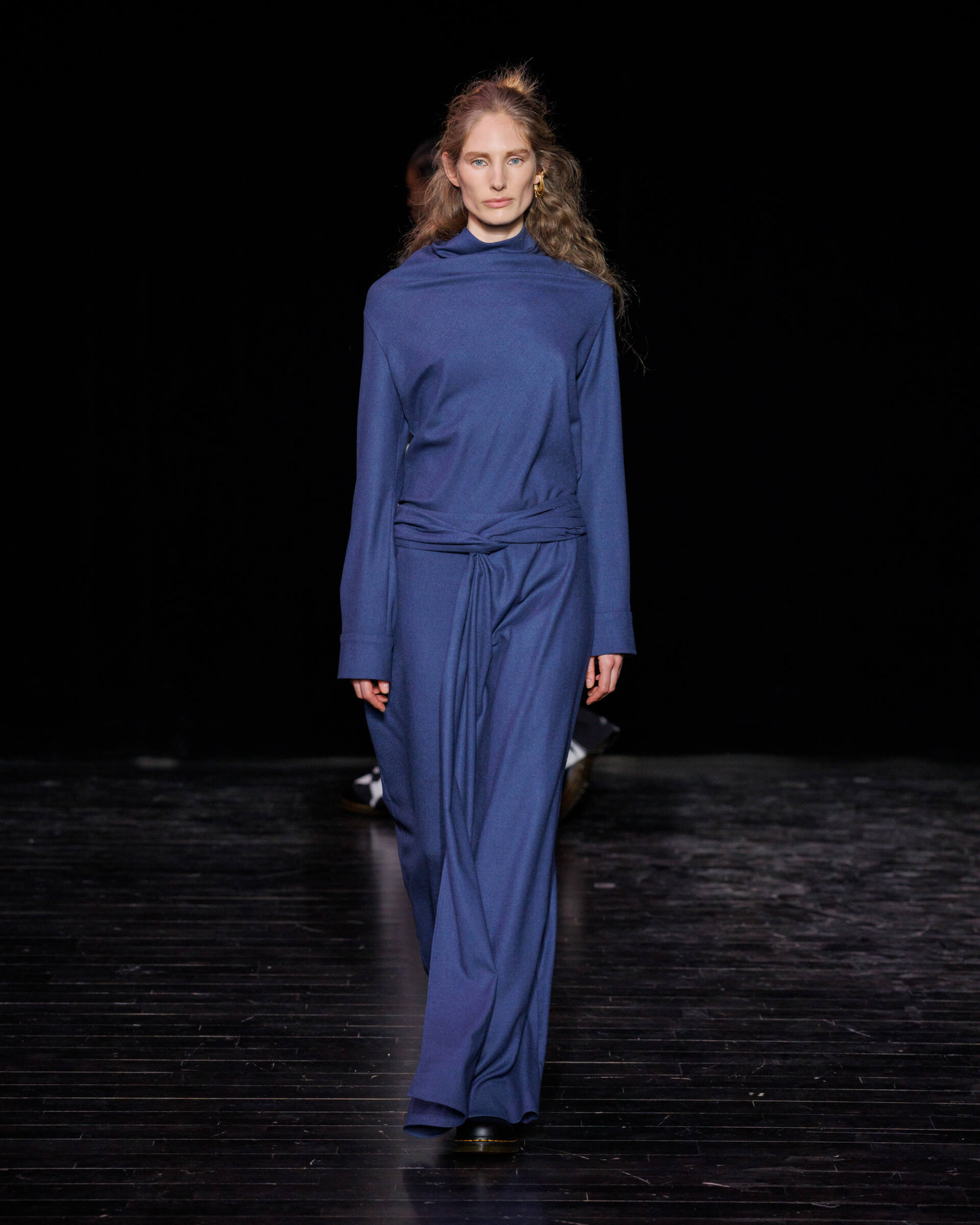Knitwear takes center stage, offering infinite freedom of movement and drape, lending itself to a true exercise in style. Meanwhile, corduroy is reimagined through a subtle play on textures, balancing sensuality and precision. Colour becomes a true field of exploration. Deep shades of blue and brown, worked on fabrics of varying thickness, blend and layer seamlessly. Some appear in gradient effects, evoking the shifting shadows of twilight, enhancing the depth and richness of the collection.