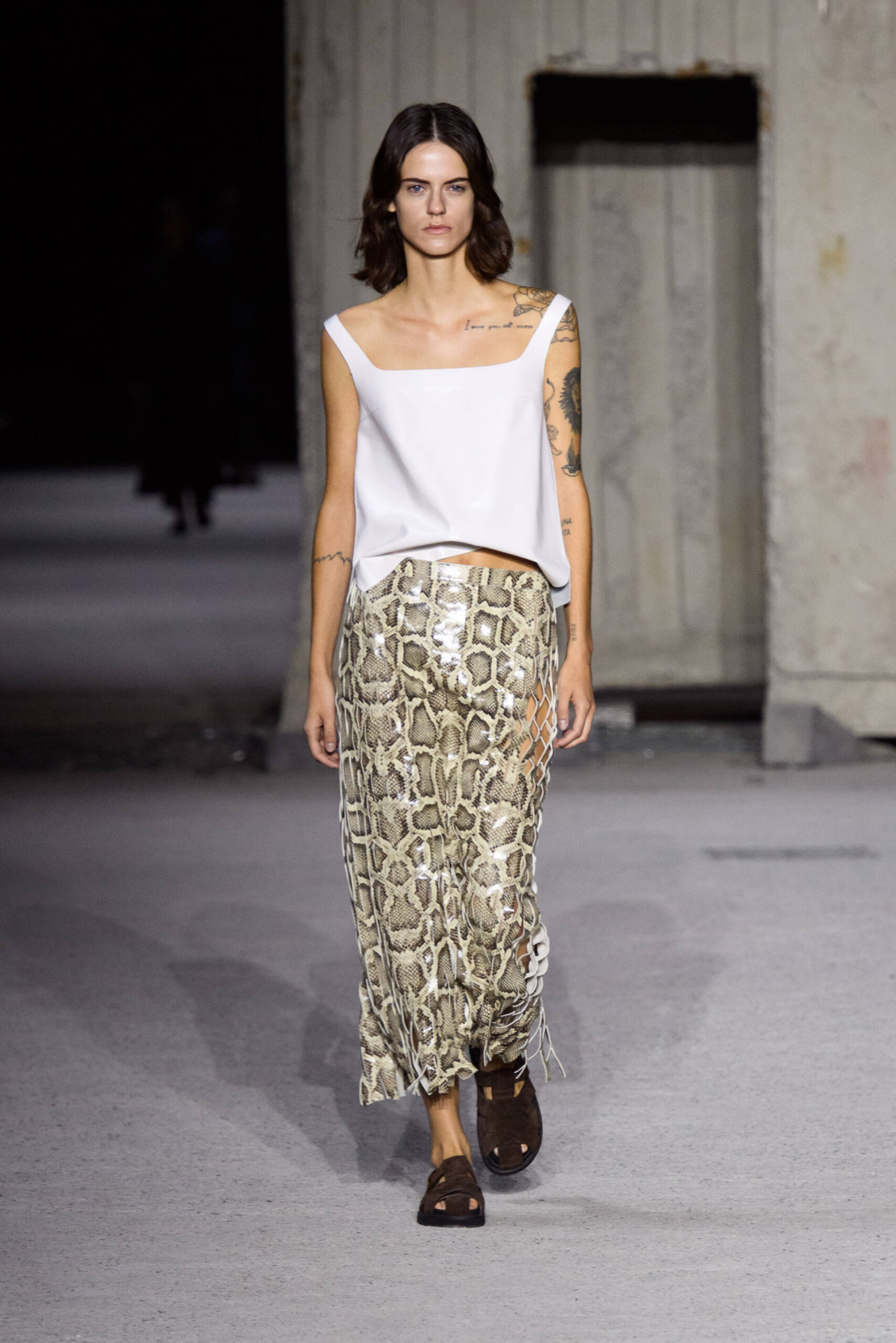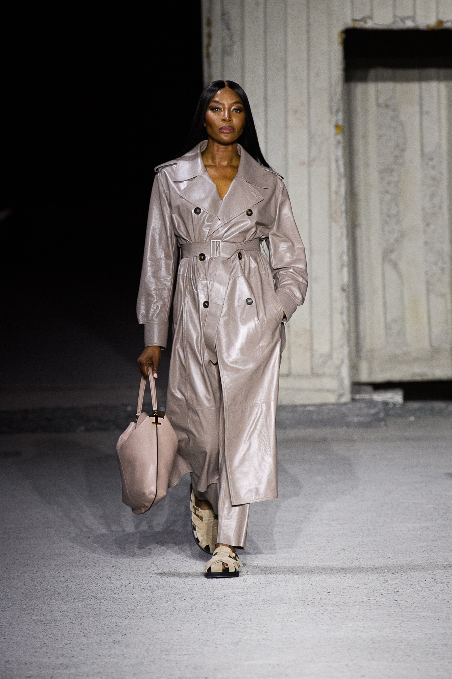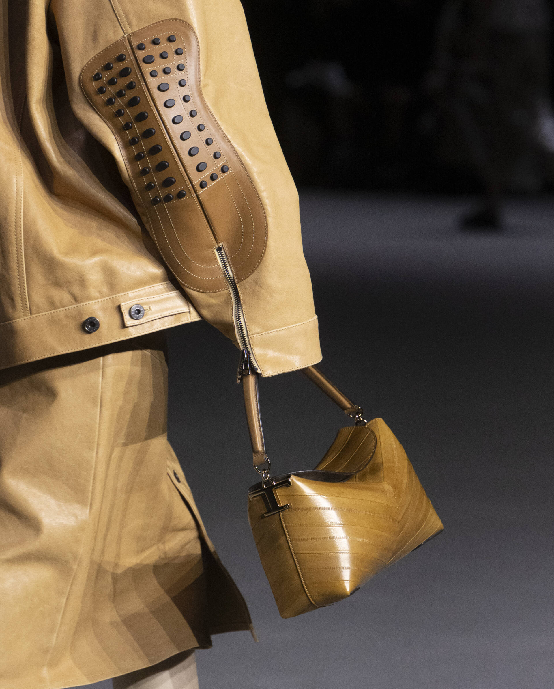 The sartorial dress with a structured jacket with oversized shoulders and wide, high waisted trousers is the starting point to build a wardrobe made up of unexpected combinations. The men’s style jacket is worn over the leather slip dress, the trousers are combined with a bustier that highlights the waist, the shirtdress becomes a sensual knitted body-conscious dress and the boxy shaped trench features python print, the Gommino biker is in leather and oversize. Not forgetting the full leather pieces, a testament to the brand’s expertise in leather crafting.