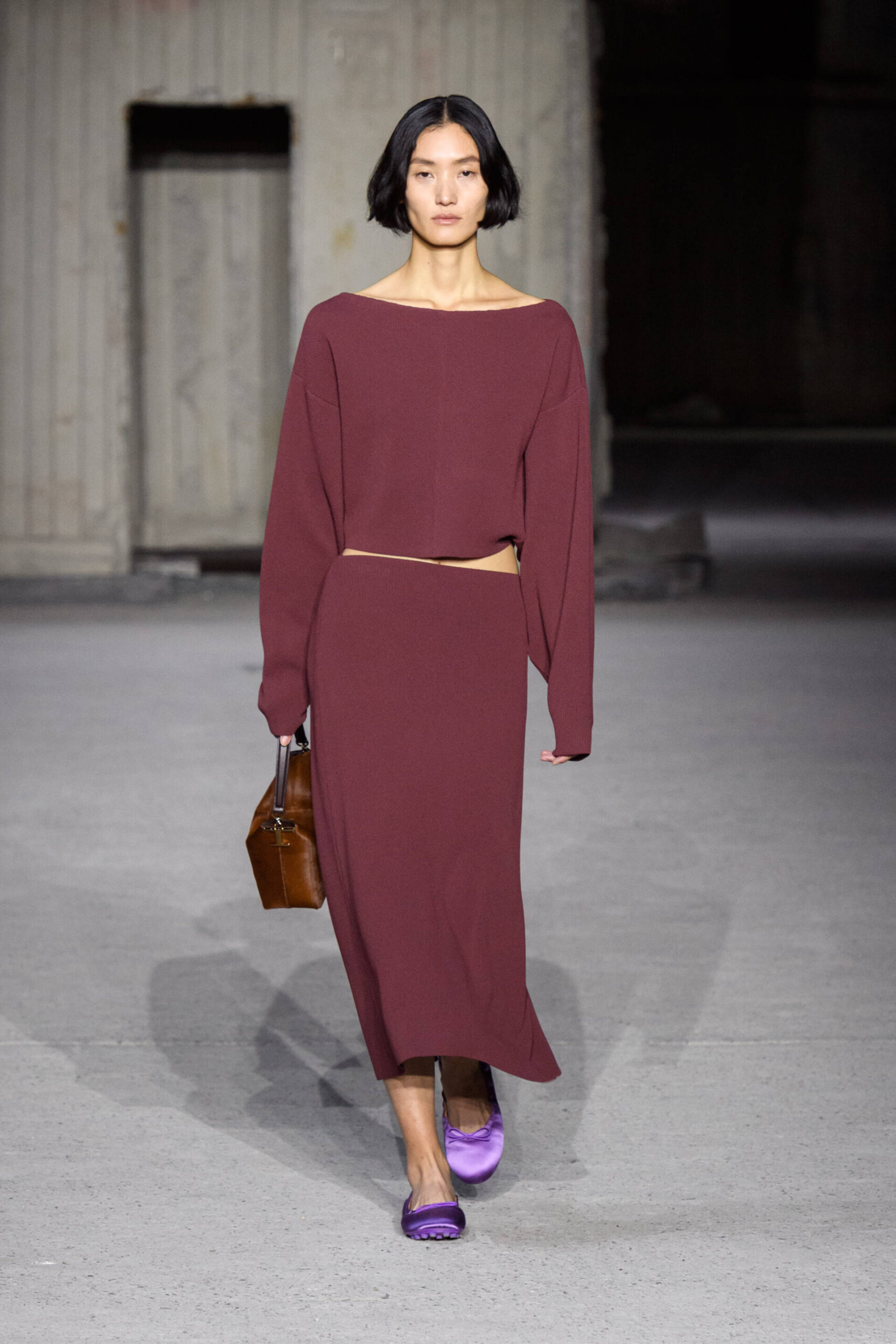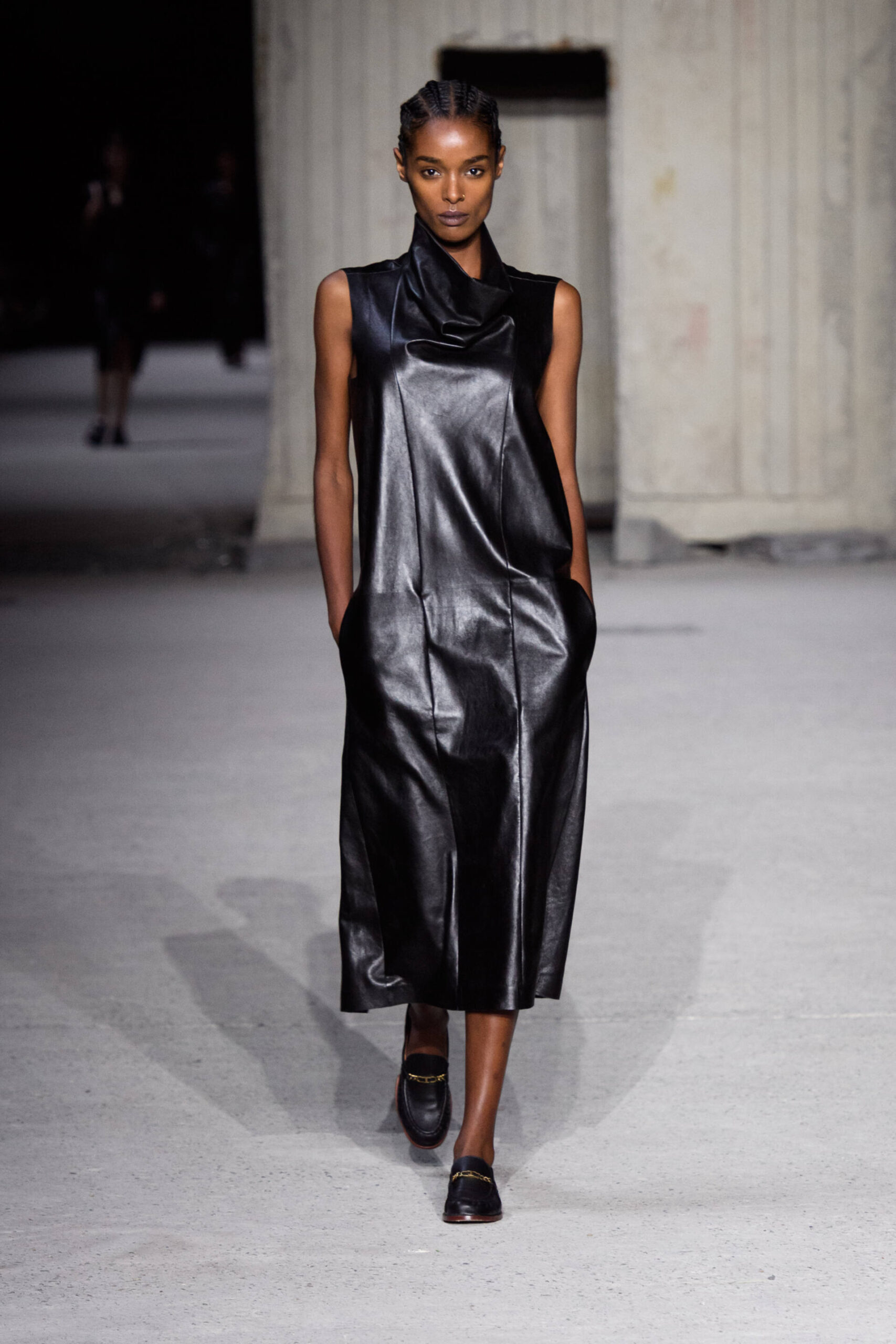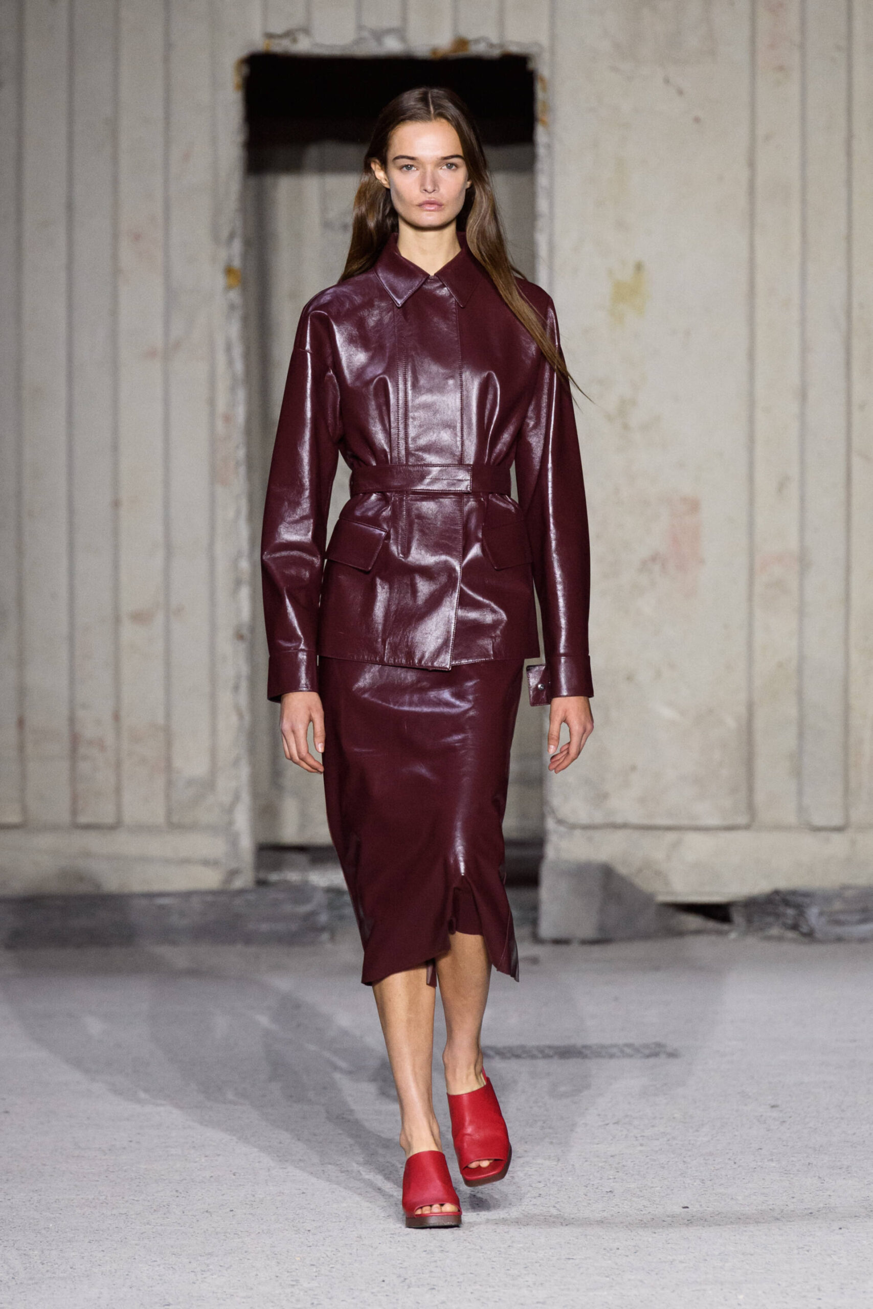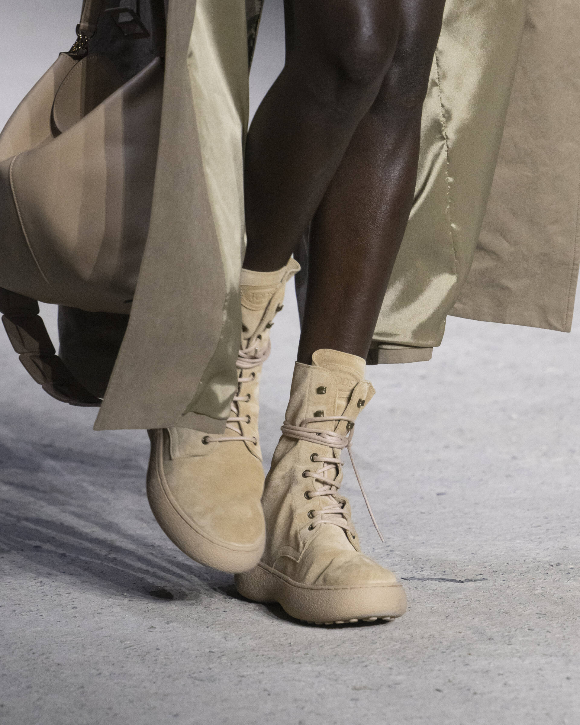 The sartorial dress with a structured jacket with oversized shoulders and wide, high waisted trousers is the starting point to build a wardrobe made up of unexpected combinations. The men’s style jacket is worn over the leather slip dress, the trousers are combined with a bustier that highlights the waist, the shirtdress becomes a sensual knitted body-conscious dress and the boxy shaped trench features python print, the Gommino biker is in leather and oversize. Not forgetting the full leather pieces, a testament to the brand’s expertise in leather crafting.