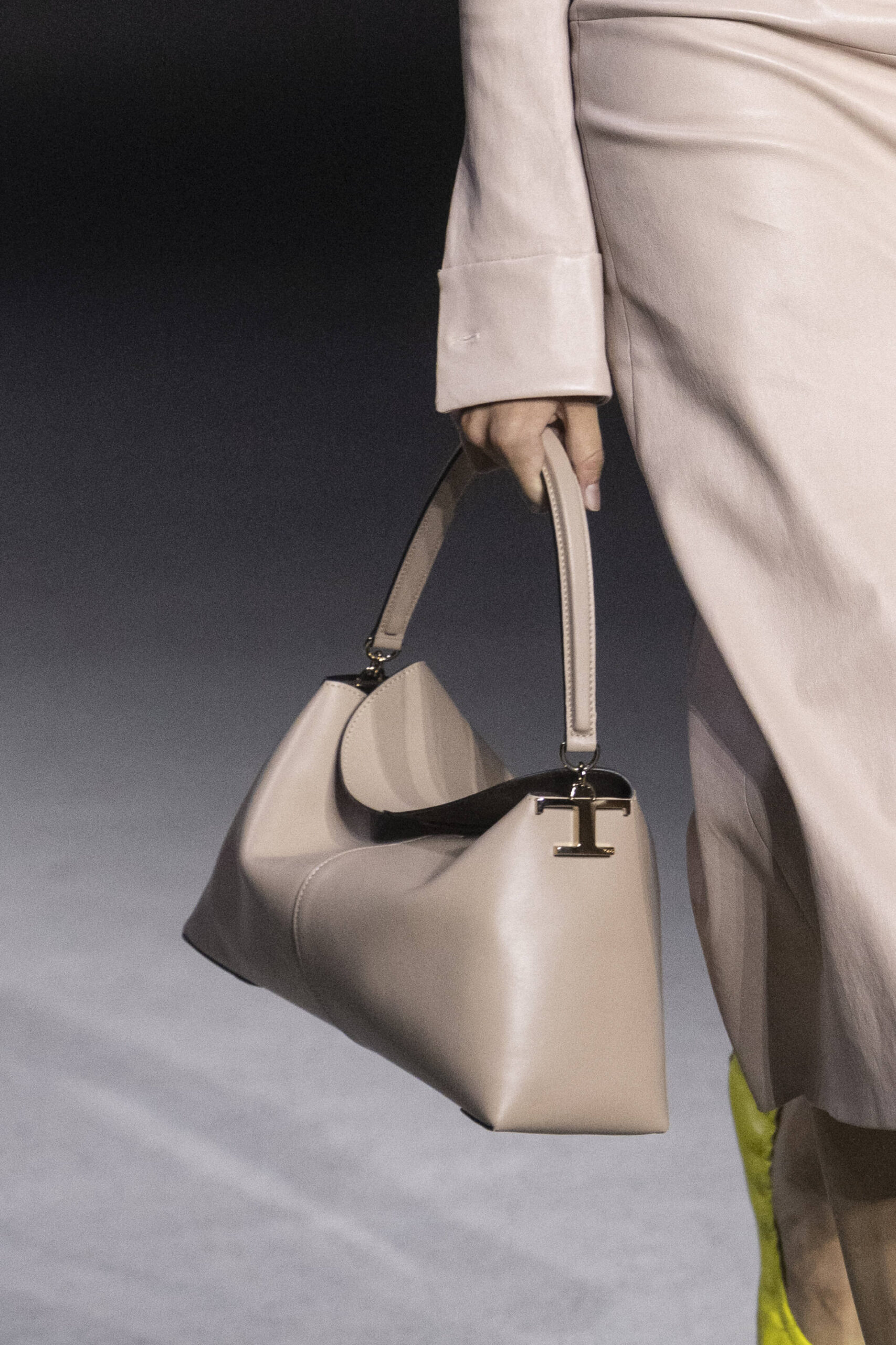 The traditional sandal has a square and important sole, crafted with soft leather or suede. The new Bubble ballerina has a giant pebble sole in contrasting and vibrant colours. The T Timeless family of bags, recognisable for the geometric simplicity of the construction and the preciousness of leathers, multiply with different sizes and new shapes and silhouettes in a multitude of unexpected materials.
