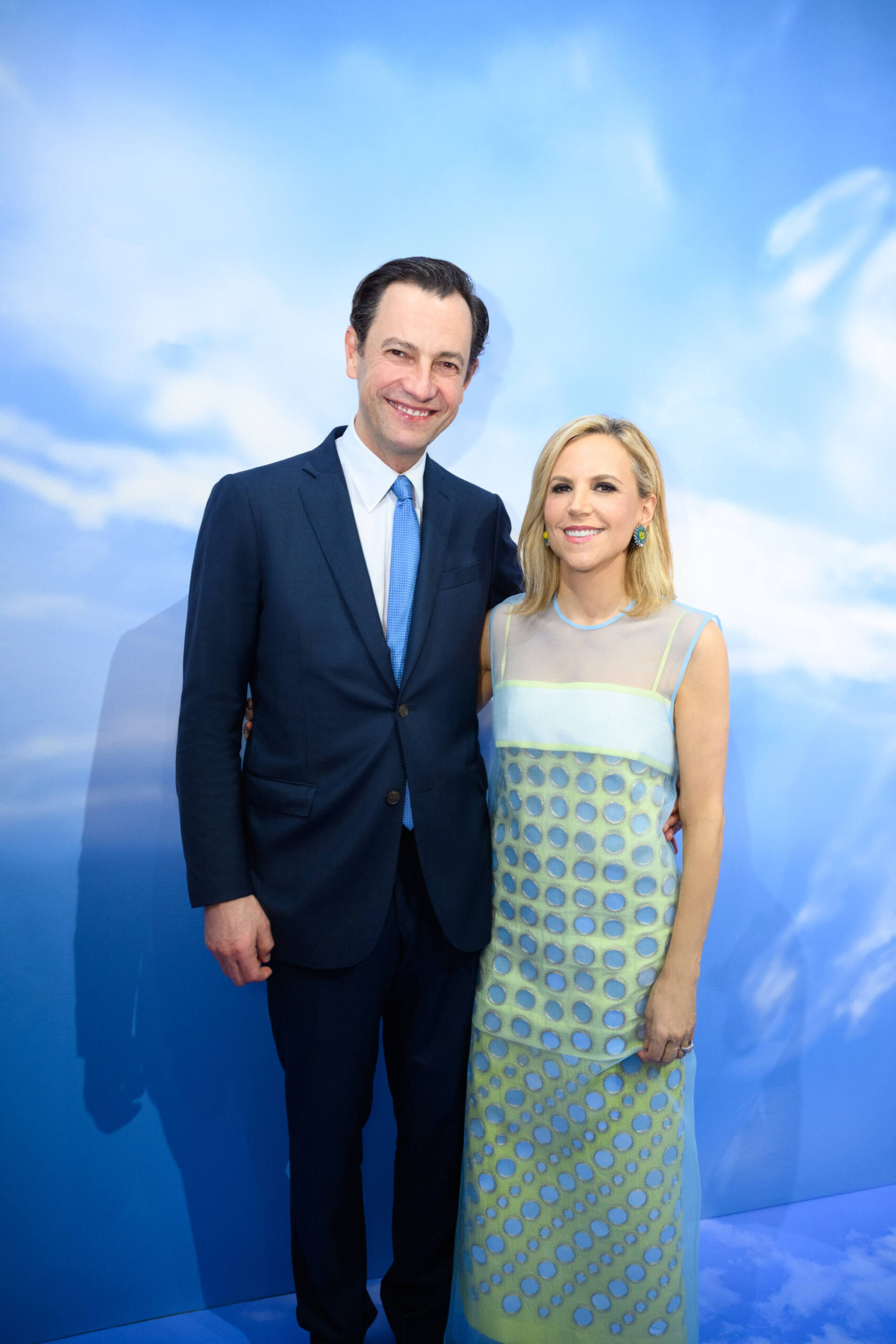 The installation has a surreal quality with inflated T Monogram sculptures perched on cloud-like structures and set against an animated backdrop of blue sky and soft clouds, creating an ethereal environment on the vibrant shopping boulevard.