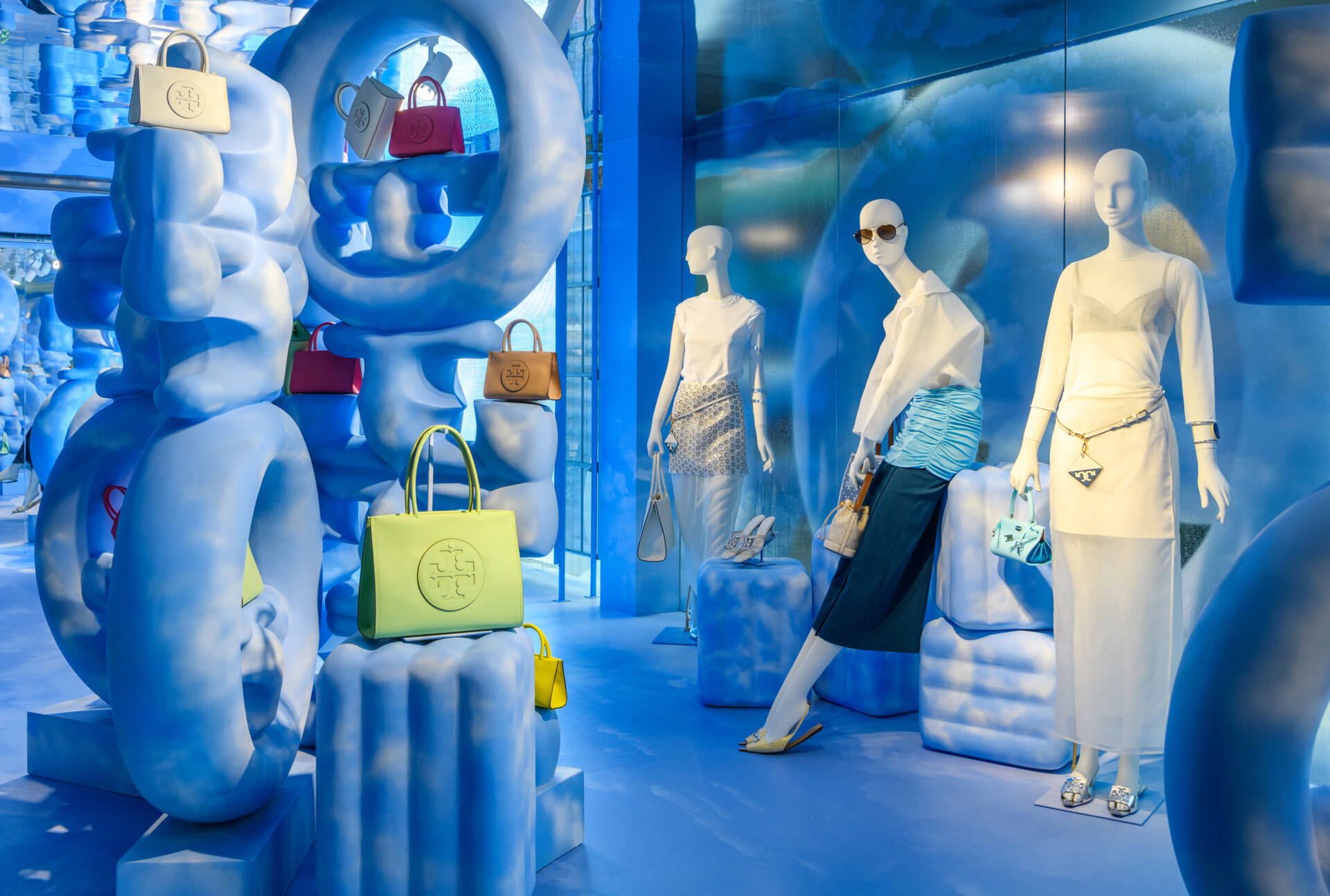 The interior of the pop-up includes additional T Monogram sculptures, which serve as a display for an assortment of handbags, footwear and ready-to-wear from the Spring/Summer collection. It includes the new T Monogram denim collection as well as the Ella Bio, the evolution on an iconic tote, crafted in an innovative plant-based leather.